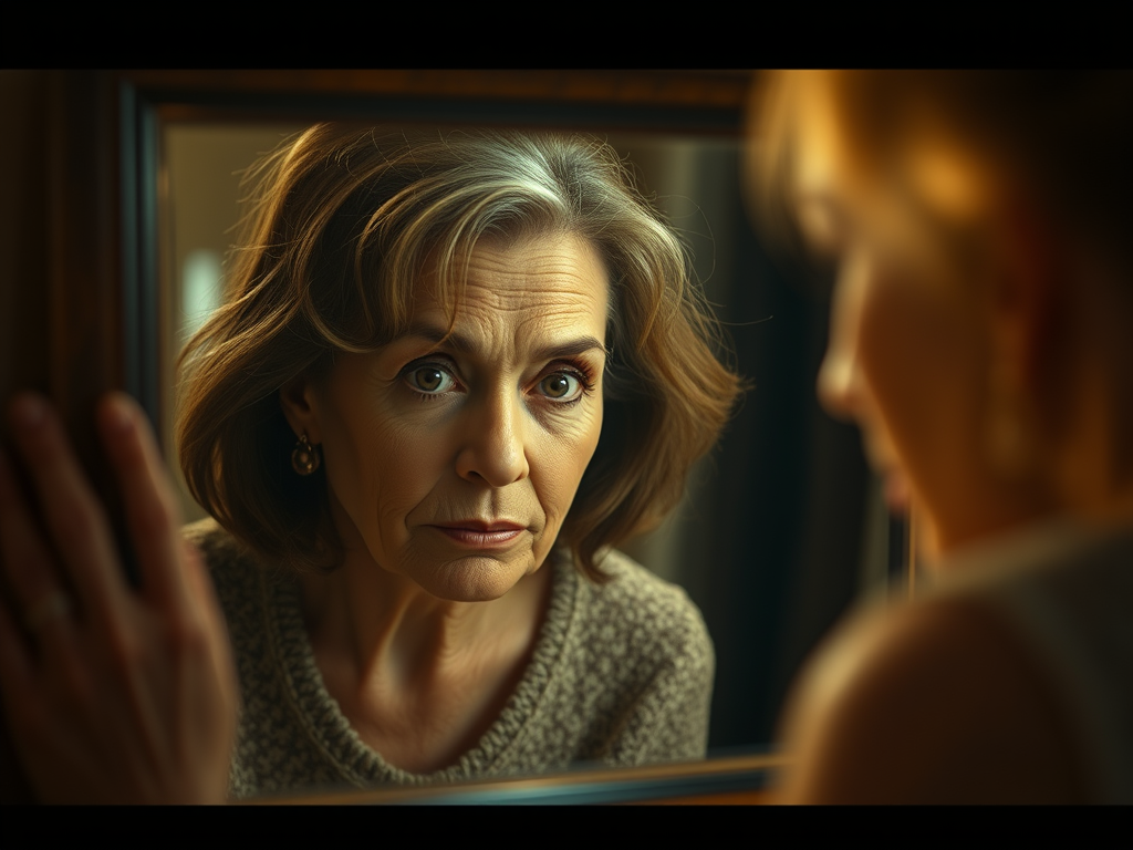 An older woman looking in a mirror at her younger self with brown hair and brown eyes